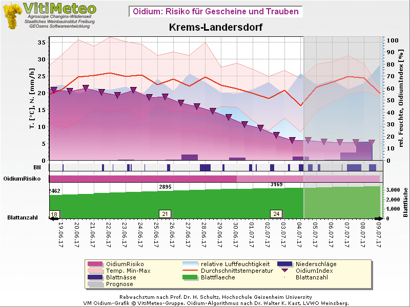 Im Prognosemodell VitiMeteo wird neben dem aktuellen Peronosporarisiko auch das Oidiuminfektionsrisiko grafisch dargestellt. Das Modell nennt sich Oidiag und wird in Form des Oidium Indexes abgebildet. Es berücksichtigt auf der einen Seite die Anfälligkeit der Rebe nach dem aktuellen Entwicklungsstadium der Rebe, das sogenannte Mehltaufenster und auf der anderen Seite die witterungsabhängigen Entwicklungsbedingungen für den Echten Mehltaupilz. Den drei Bekämpfungsmaßnahmen im Mehltaufenster (letzte Vorblütespritzung und die beiden Nachblütespritzungen) wird dabei eine besondere Bedeutung zugeschrieben. In diesem Fenster sollen die Spritzabstände dem Zuwachs der Rebe angepasst werden. Kurz nach der Blüte hat in der Regel eine Teilentblätterung in der Traubenzone zu erfolgen. Die besten Präparate sollten in dieser Phase zum Einsatz kommen. Längere Trockenperioden begünstigen die Infektionen bzw. die Pilzentwicklung.